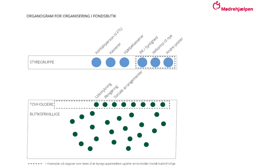 Få inspiration i styregruppeorganogrammet til, hvordan I organiserer jer bedst muligt i butikken. Mange års erfaring med butiksdrift har vist, at det er vigtigt at fordele de daglige opgaver i butikken ud på flere personer, og at der er frivillige, som har lyst til at tage et overordnet ansvar for den daglige drift.